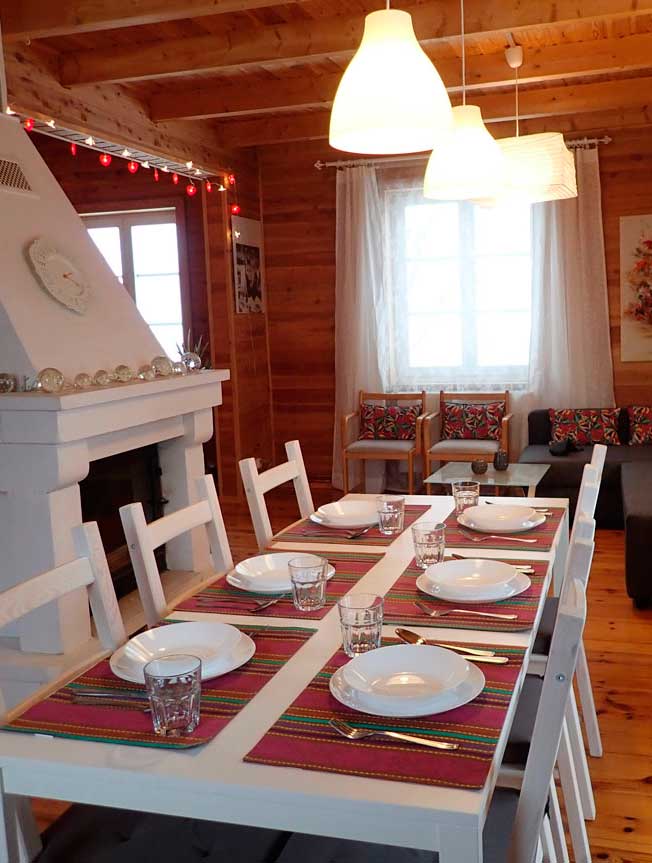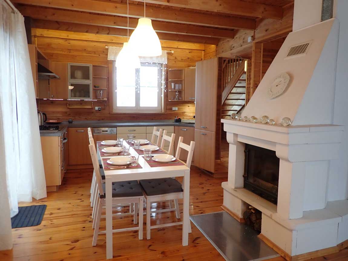 ......kuchnia, ze stołem jadalnym i kominkiem..
